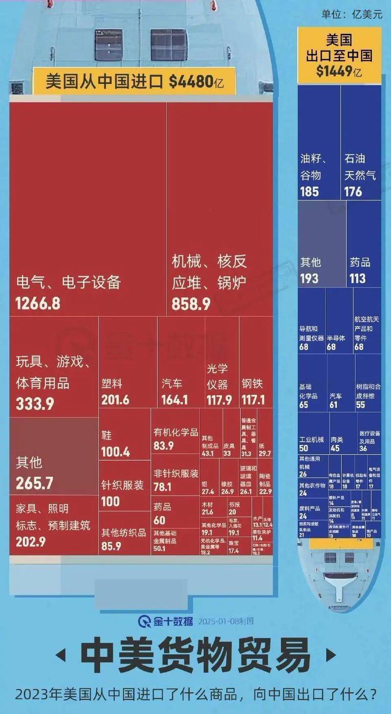 从下面这张图能看出,2023年美国和中国的贸易中,中国对美国出口的产品主要都是工业品,美国对中国出口的产品则是农业产品和能源占大头。