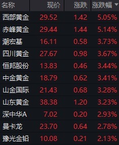 早盘,黄金概念板块表现活跃。截至发稿,西部黄金、赤峰黄金涨超5%,潮宏基、四川黄金、恒邦股份、中金黄金、山金国际、山东黄金等涨超3%。