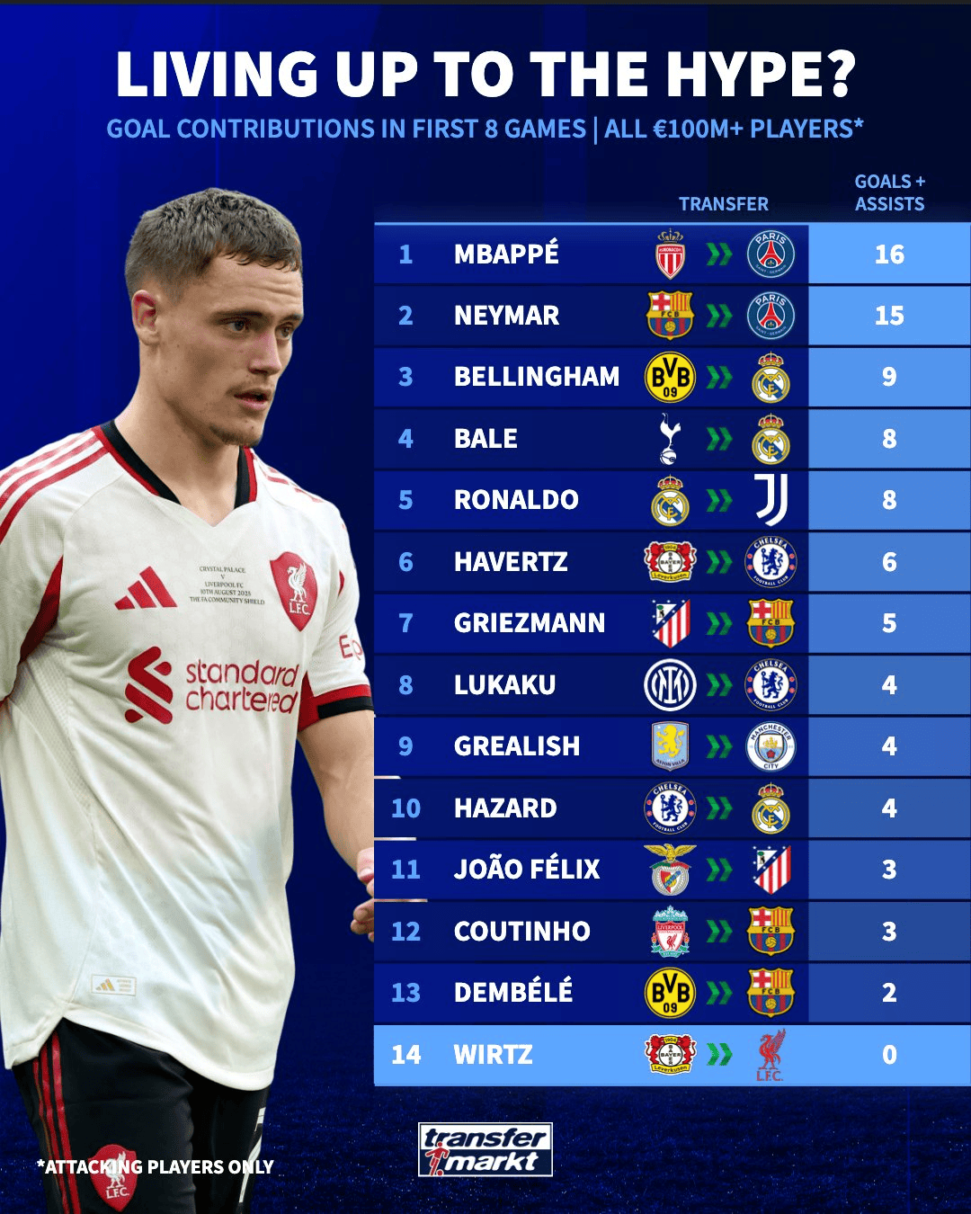 德转发布榜单,统计了转会费至少为1亿的球员前8场正式比赛参与进球的数量。